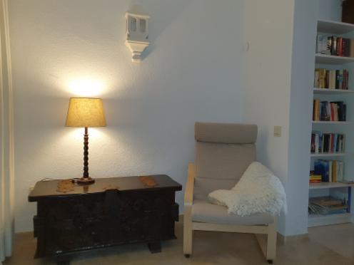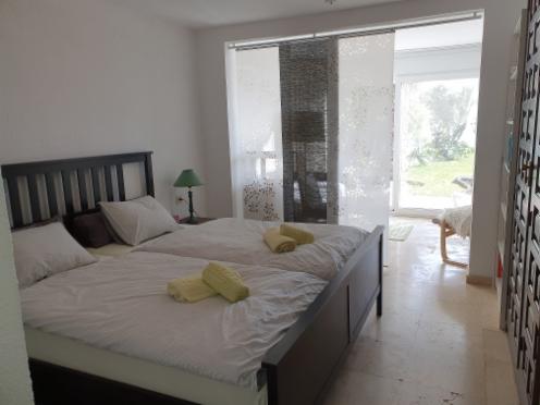 Doppelbett mit 2 Federkernmatratzen zu je 90 x 200 cm. Dieses Schlafzimmer hat über den Vorraum einen direkten Zugang zur Terrasse. Hier befinden sich ein weiteres Bett (90x200cm) und eine Leseecke.